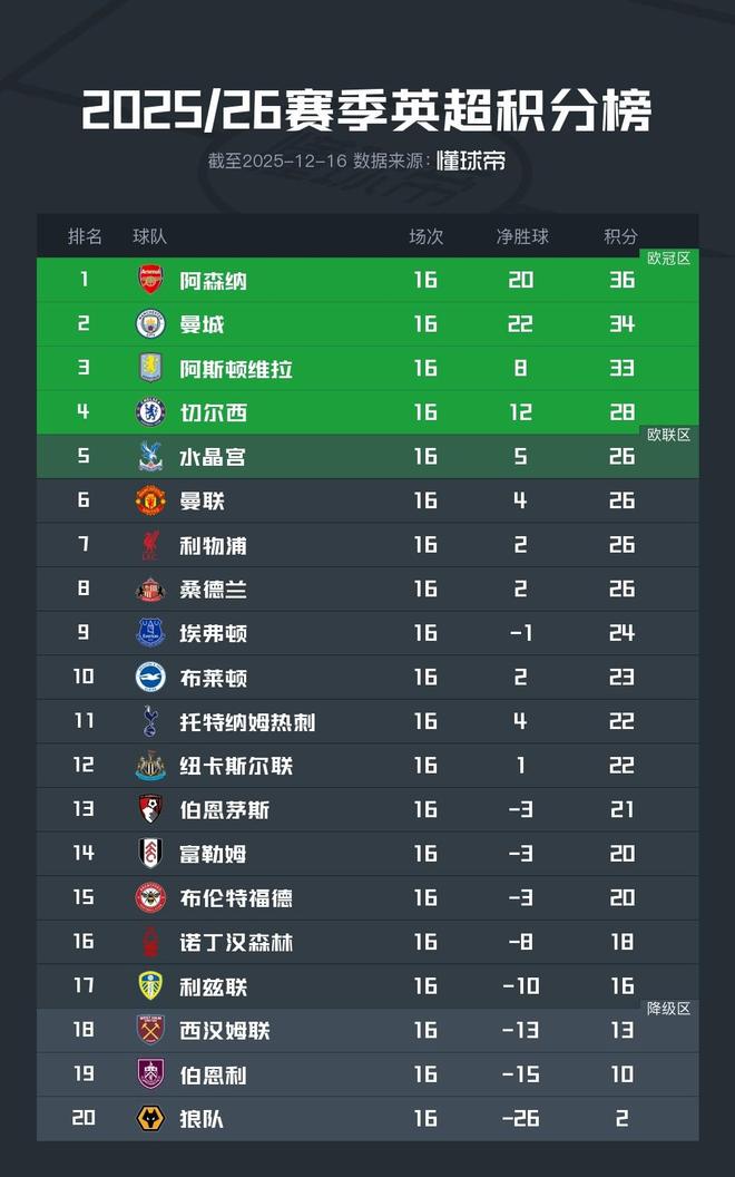 北京时间12月16日,2025/26赛季英超联赛结束了第16轮的全部较量,积分榜的形势也产生了进一步的变化。